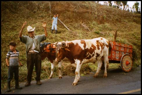 Looking at this picture, one might gather that Costa Rica is a bit behind the developed world in transportation. Actually, this old geezer hooks up his team every morning and parades up and down a stretch of road awaiting passing tourists. The tour buses stop, people give him a dollar and he stands for a picture. Very Enterprising!