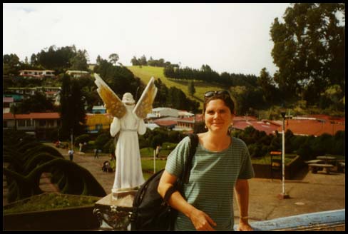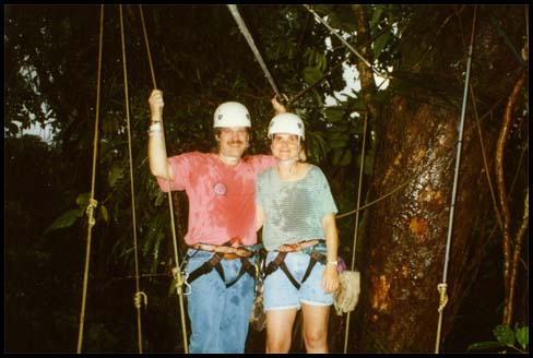 Here's a good photo of Sharon taken from the entrance to the church. Before donning our bathing suits and jumping in the hot springs, we decided to go on one of the numerous canopy tours offered around the countryside. In these tours, you suit up in a harness and climb (or get winched) high into one of Costa Rica's humongous trees. These tours are billed as a learning experience for studying the rain forest canopy. In fact, they are more like thrill rides where the guides snap and unsnap you off of one line or another, permitting you to race between trees as you move down the hill. Not much time for observing the ecosystem, but very exciting!