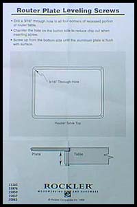 The leveling screws are a nice feature, however, I would have preferred each corner of the plate be drilled and tapped for a set screw. I think it would be easier to level the plate. Overall, I think the people at Rockler have developed a very fine product. I was very pleased with it and wouldn't hesitate recommending it to others. I would wait for the newer version with the starting pin and get the template for it when available. Afrim Hoxha For more information about Rockler's router table insert, you can access their webpage by clicking here. |