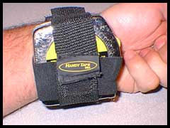 Afrim Hoxha (photo credit): At first glance I thought this would be worthwhile, however, it actually became quite uncomfortable after a while, especially with a large tape measure in it. My wrist area would perspire because of the strap. I don't want to say it's a bad product because it seems it would be a more efficient gadget if used with a smaller tape measure. For me I think I will probably store my tape measure on my tool belt. Franco Clements: I am accustomed to using a 1" wide tape so I might be doomed from the start to be uncomfortable with a holder located on the wrist. I find that my 1"x 25' tape is too heavy to be worn there and I also run the risk of "dinging" the furniture part on which I'm working. I believe from my experience as a framer and deck builder though, the Handy Tape holder would be just the ticket for the cut man in that occupation. It is a good idea. I believe there are workers who can and will use it. Jay Towles: I strapped the Handy Tape Holder onto my left wrist, I am right handed, put a 16' tape measure in the adjustable tape measure holder, inserted a pencil in the pencil holder and went to work. It took a while to get used to having the Handy Tape Holder with the weight of the tape measure strapped to my wrist. It took even longer to break myself of my habit of sticking the pencil behind my ear. But after enough time had passed, I learned to use the device as it should be used and did not really notice the extra appendage on my arm. The Handy Tape Holder is available in leather or nylon, and comes in three sizes. I tested the large nylon version. The device straps around the user's wrist with a nylon strap and is adjustable by Velcro sewn onto the strap. The tape holder is constructed of stretch nylon with a nylon/Velcro securing strap that goes over the top of the tape. The pencil holder is part of the tape securing strap sewn in to a tube. The pencil holder will accommodate a regular pencil, or a full sized carpenter's pencil. I did find that the regular pencil was easier to get in and out of the tube. I tried the Handy Tape Holder with a 25' Starrett, a 25' Lufkin and a 25' Stanley Powerlock. All three of the 25 footers did fit, but just barely. Also, it was a bit cumbersome with all that weight strapped on to one side of my wrist. I used a 10' Lufkin and a 16' Stanley Powerlock with very satisfactory results, but my favorite is a Craftsman Posilock tape measure - it's the lightest 16' tape measure I have. Does it sound like I have a lot of tape measures? Well, I do, and they are scattered all around the shop. I will use a tape, sit it down, move to another area of the shop with my project, and then not have a tape. The Handy Tape Holder worked out well for me because I did not have to pick up, put down, search for, or clip on to my belt or my trouser pocket a tape measure at any time. It was nailed to my wrist! Right there whenever I needed it. Want to buy a good used tape measure? I have extra ones now. The Handy Tape Holder is a great time saver for anyone who does not wear a full toolbelt with a tape measure pouch. You never have to look for your pencil or your tape measure, they are always right there near your fingertips. Jim Barry: My personal opinion is that I wouldn't use a product like this or even buy it for that matter simply for that safety issues involved with woodworking and power tools in the shop. Jeff Jager: Design: The tool design was solid with one specific functional issue. The elastic bands that run around the sides of the tape infringe on the locking mechanism of the tape. This simple design problem makes locking/unlocking the tape a difficult and two-handed task. Although it is simple to hold the tape, it limits the ability to multi-task. In my deck construction, I often held a board level from my stringer and liked the ability to use the tape to determine if the distances were correct. With the tape locked, this trick was possible, without it locked, it was a two person task. Functionality: The Handy Tape was completely functional in keeping the tape available for use at any given moment. Although it still takes two-hands to get the tape started, the ability to hold the tape at the desired measurement and have an available hand for marking or recording was a great time saver. Although I must admit, the new "growth" on the inside of the arm was often in the way when not measuring. I am sure that with continued use, the tape would become less noticeable. With the short time I used the tape, I generally took the tape off when I was not doing a lot of measuring. Personal Thoughts: The Handy Tape will provide individuals who do a lot of measuring a great way to always have their tape at hand. I believe the professions or persons who will gain the most from this tool include interior designers, cabinet designers, and any other individual who needs to do a significant amount of measuring. The device lends itself to easily measuring windows, cabinets, rooms, and anything else where the goal is to record the measurements and move efficiently to the next measurement. I greatly appreciate the opportunity to put the Handy Tape to the test and was very impressed with the tool. Mike Reese: The other problem I found was that, in many cases I need to measure from left to right instead of right to left. I found it a bit awkward for that. I did like the quick, easy accessibility. It was nice not having to dig for it in my pocket or not having to clip it back on my belt. Steve Coakley: The following is a list of