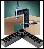 A neat little shop aid that's long over due. Sure, you can make your own, but for the price of this little device, it's hardly worth the time and effort. It runs about twenty bucks with two 5" mini clamps. The price without the clamps is about ten dollars. You can make a perfectly square corner assembly with little or no trouble. It's well made of high impact, rigid polycarbonate that does not flex and measures 8" x 8" x 1-1/2". I checked for squareness with my good Bridge City square and found it to be right on. It has nice little notches to allow clamps to get a bite, and has the inside and outside corners relieved for clearance. Glue does not stick. It just peels right off. There are so many places you can use the Clamp-It. Any place you want to hold two pieces together at 90°. Think of it as a square you can clamp. It's great for holding two sides of a case, holding a bracket square while attaching, joining two sides of a frame, mounting a shelf, or assembling a drawer. Besides using the Clamp-It loose with clamps, you can also mount it to a base and clamp the components to it. It works great as a positioning jig on a drill press. All in all, a nice, inexpensive