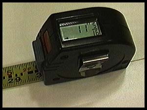 The Starrett suffered from two other shortcomings: If you pulled the tape out too fast, it would return a wild reading as pictured at left. Nudging the tape a couple inches either way returned it to normal. It also wouldn't give a reading finer than 1/16" and could have a discrepancy of 1/16" between the measurement on the readout and what was shown on the tape where it exited the case. |