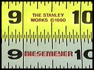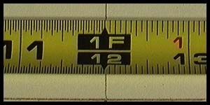 The 16' Ohio Forge was printed out of square from one edge to the other. It is 1/64" off along the upper edge but is nearly 1/32" off along the lower edge. This discrepancy is generally repeated along the whole length of the tape Also note how much closer in length the 16th and 32nd markings are in comparison to the Stanley. Under 12", the Ohio Forge is much more difficult to read. |