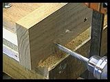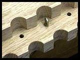 Another method to avoid splitting the holes in the template ends uses a modified lag bolt to tap the holes and actually cut threads into the oak. Take one of your lags and file a rabbet into the end across the threads. In effect you're creating teeth to cut matching threads in the oak. Run this lag into each of the 8 pilot holes in the template ends before you assemble the jig and you'll eliminate any chance you'll split the oak when tightening the lags down. The first time the jig was used on a scrap panel, many problems arose. For those experiences and how they were fixed, this article is concluded on the next page. |