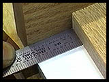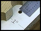 Drilling Your Stop Holes The simplest and fastest way for making stops is clamp one template over the other and drill a row of pin holes in each template - a couple shelf pins can then be used to stop your router. The procedure - set your router on one template with the guide bushing in a dimple; then draw a line around the right side of it's base. Add a 1/4" or so and this is the ideal place to drill a hole. Clamp one template over the other, shifted according to the distance determined by your pencil line, then take your router for a test ride and drill a bunch of holes. Take it easy - it's your first time behind the wheel. ;) Figuring the Pin Hole Offset Using a piece of scrap (the melamine in photo), clamp your fixed rail down and drill a hole with the router. I have a cute little ruler from Bridge City Tools which has markings on the end and it's easy to see the offset for my router from the rip line though the template holess. Mine read 5/32" to the hole center but yours might vary depending on the hardware you're using and how well you ripped the holes in half. If you don't have a ruler with end demarcations, clamp the template exactly one inch from the scrap edge and then measure from the edge to the center of the hole. Positioning the End Rails to the Templates In addition to this offset is the distance I want the end rail to hang down below the templates to hook the ends of my panel. This hang down is what you use to align your workpieces when mounting the jig - I chose 1/2". It was easy to mark by slipping a piece of 1/2" scrap under the template.