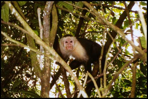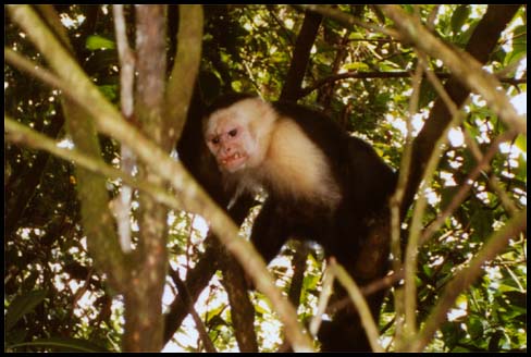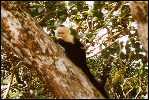 Not all the monkeys are encountered on the beach. This one is part of a troop we found deep in the rain forest. A group of about 30 hikers had gathered along the trail to watch this troop forage through the trees overhead. One of the monkeys seemed miffed at our presence and came down to eye level to challenge the guy taking pictures next to me. Pretty scary, huh?!