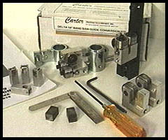 The upper guides can adapt to this angle simply by rotating the whole assembly slightly right or left on the saw's guide post. Without anything from the instructions, I mistakenly tried to adjust the bearings parallel to the blade by rotating the assembly slightly off center to the thrust bearing. When the upper assembly was finished, I found out I couldn't do the same for the lower assembly as it isn't adjustable. Instead, I backed off the bearings, re-tracked the blade to adapt more parallel to the lower bearings and then started all over with the top. (Groan) One more glitch. The whole upper assembly relies on three set-screws to mount to the guide post. A bothersome design fidget is the set-screw directly behind the upper thrust bearing. In order to tighten this screw, the blade needs to be loosened and the bearing assembly removed if you are using a regular Allen wrench (not supplied by Carter). Fortunately I had a ball-end Allen driver (yellow handle - top photo) which let me tighten this screw from an angle. If Carter isn't going to supply such a wrench for their customers, perhaps they could move this screw to another point around the post. Any other point would be better than where it is. Great Stuff The main advantage is the position of the upper and lower thrust bearings. Unlike the original Delta assembly, which is utilized by the Iturra and Johns bearings, Carter rightly turns their thrust bearing 90 degrees so the back edge of your bandsaw blade is shoved against the curved outer surface of the bearing. This one-point contact, linear to the blade travel, seems far better than having the blade pressed against the bearing face where rotation of the bearing actually rubs across the back of the blade. No matter how you look at this feature, it sets the Carter guides a notch above the other contenders where durability of the blade is concerned. I liked it! Another durability benefit arises from the shear number of bearings Carter sends you - ten of them, all the same size! If either the upper or lower thrust bearings starts to get sticky, simply swap it out for one of it's under-worked, side-mounted cousins. Little things like this help mitigate the extra cost of the Carter guides and the pain of installation. The Iturra Guides The Iturra bearings, 3/8" x 3/16" in size, are stacked in pairs on each side and pinned into a milled slot in the aluminum - extremely simple. I had to file the aluminum a bit to get it to slide into the square recesses which housed my steel blocks but this possibility is addressed in the extensive instructions which came with the guides. And what instructions! Unlike most manuals you get with your tools, Iturra sets a standard for giving their customers as much information as reasonably possible. Some of the issues addressed are blade tracking, wheel alignment, types of blades used for different operations, spring compression, bearing design and they even go one step beyond to suggest you don't use their Bandrollers for saw blades narrower than 1/4" - use Cool Blocks instead. Not only does this guy know bandsaws; he's honest too! The bearings you get are sealed and are similar to those you might get with a small router bit. Even though they are small and will revolve much faster than the other bearings tested, since a bandsaw blade moves much slower than a high-speed router, figure on Bandrollers lasting a long time. If or when they start to fade, I found it simple to drive the pin out to swap in a new set. No sweat! The Johns Guides Like the Carter, the instructions consist of one sheet but the information is concise and accurate. In the instructions, Joe Johns suggests the installation of lower bearings is unnecessary when using a sharp, accurately tensioned bandsaw blade. I agree but we'll look at that later. Unlike Carter and Iturra, he suggests you install the bearings tight to the blade. If your blade protests, due to improper welds or other flights of circumstance, he suggests you buy a better blade. That seemed reasonable. Another point of departure is the type of bearing used by the others. Instead of the sealed bearings found on the Carter and Iturra guides, Joe opts for a shielded bearing. In my mind this is OK considering how much slower this large bearing rotates compared to the others. Since it's mounted only above, it's out of the sawdust slipstream which can work dust into the bearing causing premature failure. Still, in use these two bearings oozed grease from their innards which partly found it's way onto the blade and into the cut - not good! I would suggest Joe upgrade his bearings a bit if only to prevent this side effect. Testing and recommendations of this review is concluded on page 2. |