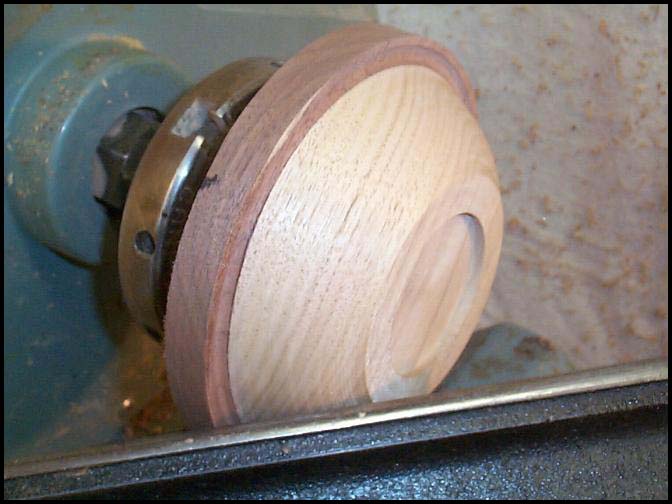 Photo 10: I have completed turning the bottom and it is now ready for sanding. Sharp eyes will notice a slight gap along the glue line between the walnut and butternut. This blank came from the end of the original board and I must have gotten some planer snipe that I didn't notice during my original glue-up. I have worked some cyanoacrylate glue into the crack and sanded to get some sawdust for filler. I hope it doesn't show in the finished piece! We encourage all our visitors to send us their thoughts, suggestions and complaints. Copyright©1997-2004WWA |