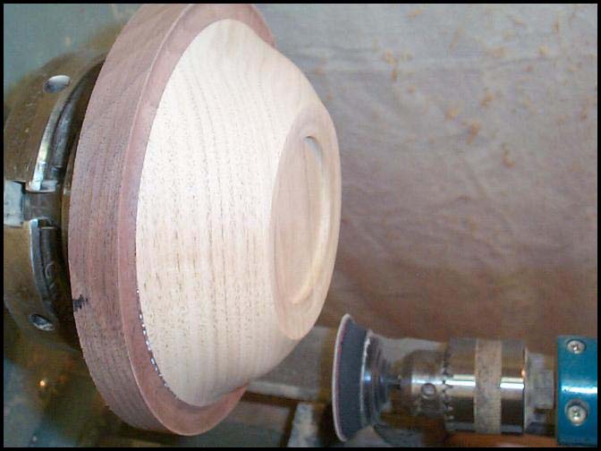 Photo 11: I have finished sanding the bottom and am now ready to apply the finish. There is still some white showing in the gap which is from the accelerator I used on the cyanoacrylate. I hope the finish will hide it. On the lathe bed you can see the 2" power sanding disk that I used to sand the inside of the chucking recess. We encourage all our visitors to send us their thoughts, suggestions and complaints. Copyright©1997-2004WWA |