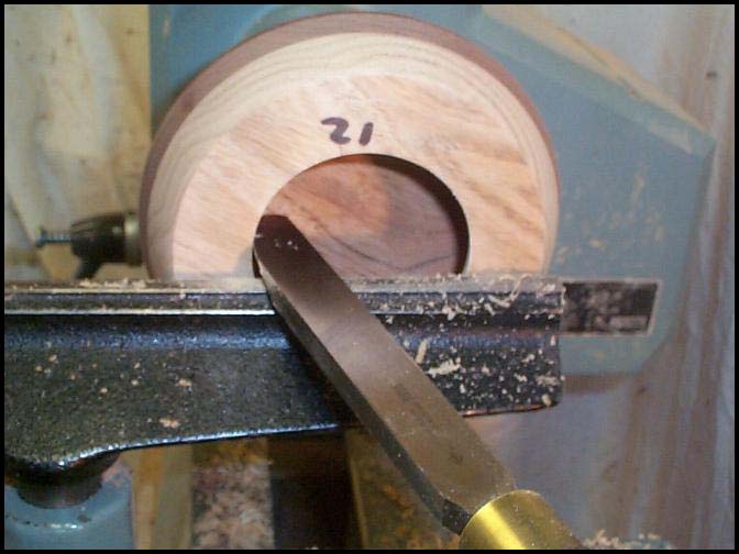Photo 22: I used dividers to set the dimension of the top hole a little undersized and the 1/4" bowl gouge to remove most of the material, using a light touch as I approached "breakthrough" to avoid tearout around the inside face of the top. Here I am using a side-cutting scraper to sneak up on the final size of the hole. We encourage all our visitors to send us their thoughts, suggestions and complaints. Copyright©1997-2004WWA |