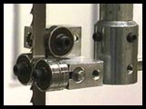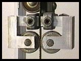 The upper guides can adapt to this angle simply by rotating the whole assembly slightly right or left on the saw's guide post. Without anything from the instructions, I mistakenly tried to adjust the bearings parallel to the blade by rotating the assembly slightly off center to the thrust bearing. When the upper assembly was finished, I found out I couldn't do the same for the lower assembly as it isn't adjustable. Instead, I backed off the bearings, re-tracked the blade to adapt more parallel to the lower bearings and then started all over with the top. (Groan) One more glitch. The whole upper assembly relies on three set-screws to mount to the guide post. A bothersome design fidget is the set-screw directly behind the upper thrust bearing. In order to tighten this screw, the blade needs to be loosened and the bearing assembly removed if you are using a regular Allen wrench (not supplied by Carter). Fortunately I had a ball-end Allen driver (yellow handle - top photo) which let me tighten this screw from an angle. If Carter isn't going to supply such a wrench for their customers, perhaps they could move this screw to another point around the post. Any other point would be better than where it is. Great Stuff The main advantage is the position of the upper and lower thrust bearings. Unlike the original Delta assembly, which is utilized by the Iturra and Johns bearings, Carter rightly turns their thrust bearing 90 degrees so the back edge of your bandsaw blade is shoved against the curved outer surface of the bearing. This one-point contact, linear to the blade travel, seems far better than having the blade pressed against the bearing face where rotation of the bearing actually rubs across the back of the blade. No matter how you look at this feature, it sets the Carter guides a notch above the other contenders where durability of the blade is concerned. I liked it! Another durability benefit arises from the shear number of bearings Carter sends you - ten of them, all the same size! If either the upper or lower thrust bearings starts to get sticky, simply swap it out for one of it's under-worked, side-mounted cousins. Little things like this help mitigate the extra cost of the Carter guides and the pain of installation. The Iturra Guides The Iturra bearings, 3/8" x 3/16" in size, are stacked in pairs on each side and pinned into a milled slot in the aluminum - extremely simple. I had to file the aluminum a bit to get it to slide into the square recesses which housed my steel blocks but this possibility is addressed in the extensive instructions which came with the guides. And what instructions! Unlike most manuals you get with your tools, Iturra sets a standard for giving their customers as much information as reasonably possible. Some of the issues addressed are blade tracking, wheel alignment, types of blades used for different operations, spring compression, bearing design and they even go one step beyond to suggest you don't use their Bandrollers for saw blades narrower than 1/4" - use Cool Blocks instead. Not only does this guy know bandsaws; he's honest too! The bearings you get are sealed and are similar to those you might get with a small router bit. Even though they are small and will revolve much faster than the other bearings tested, since a bandsaw blade moves much slower than a high-speed router, figure on Bandrollers lasting a long time. If or when they start to fade, I found it simple to drive the pin out to swap in a new set. No sweat! The Johns Guides Like the Carter, the instructions consist of one sheet but the information is concise and accurate. In the instructions, Joe Johns suggests the installation of lower bearings is unnecessary when using a sharp, accurately tensioned bandsaw blade. I agree but we'll look at that later. Unlike Carter and Iturra, he suggests you install the bearings tight to the blade. If your blade protests, due to improper welds or other flights of circumstance, he suggests you buy a better blade. That seemed reasonable. Another point of departure is the type of bearing used by the others. Instead of the sealed bearings found on the Carter and Iturra guides, Joe opts for a shielded bearing. In my mind this is OK considering how much slower this large bearing rotates compared to the others. Since it's mounted only above, it's out of the sawdust slipstream which can work dust into the bearing causing premature failure. Still, in use these two bearings oozed grease from their innards which partly found it's way onto the blade and into the cut - not good! I would suggest Joe upgrade his bearings a bit if only to prevent this side effect. Testing and recommendations of this review is concluded on page 2. |